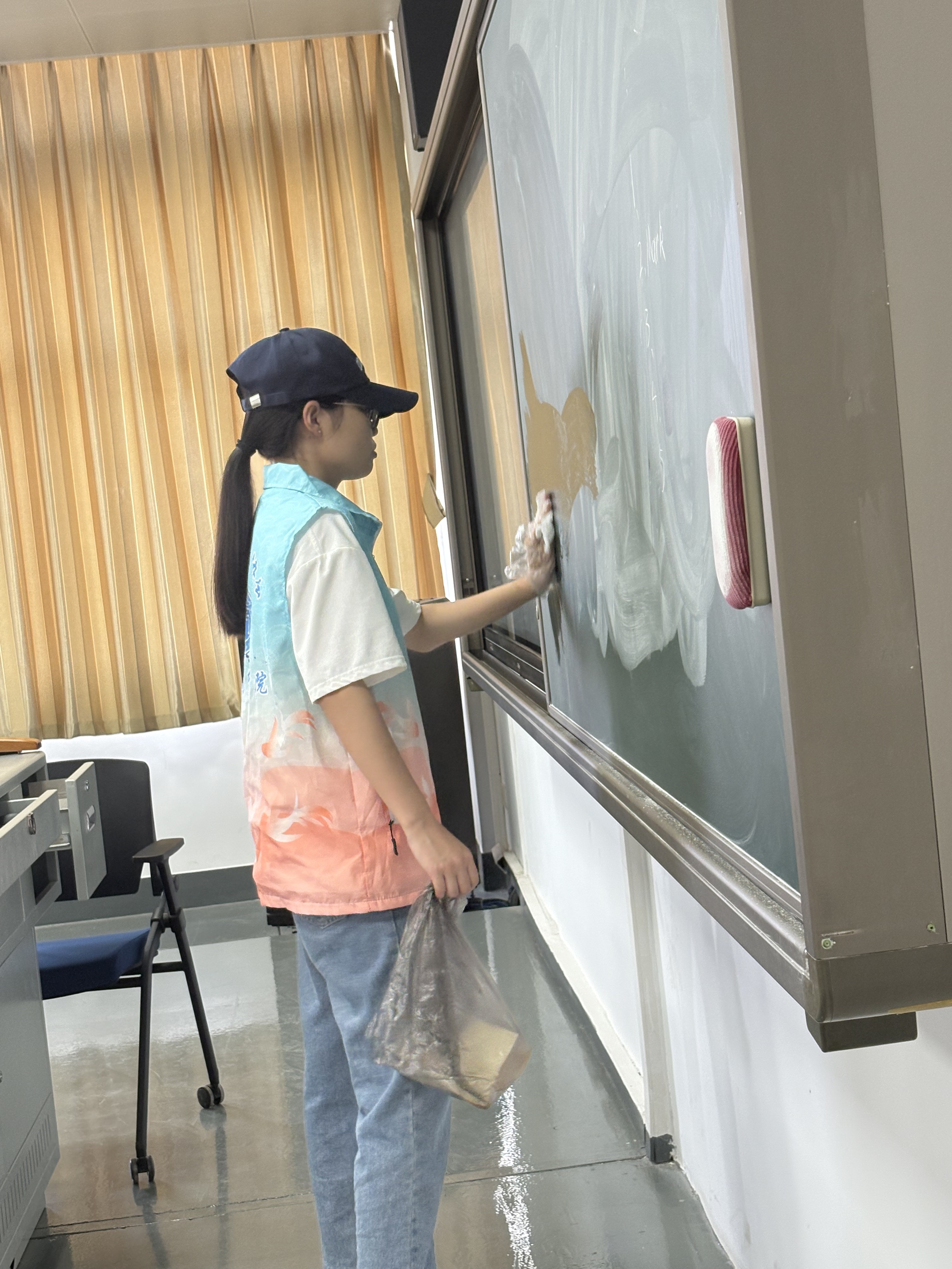 活动当天,志愿者们以扫帚为笔、抹布为墨、垃圾袋为舟,在校园的每一处角落铺展“奉献、友爱、互助、进步”的志愿长卷:于草坪与道路缝隙间弯腰捡拾垃圾,是对“环境无小事”的细致践行;在教学楼走廊擦拭扶手与公告栏,是对“服务无边界”的温情诠释;在办公室整理卫生,是对“责任无盲区”的扎实担当。面对教学楼后卫生难点区域,志愿者们拧成一股绳、劲往一处使,以“啃硬骨头”的韧劲彻底清除堆积杂物与卫生死角,将个体微光汇聚成照亮校园文明的星河,生动诠释了志愿精神不是抽象的理念,而是扎根实践、惠及他人的行动自觉,更是当代青年以小我融入大我、用青春守护校园的使命担当。