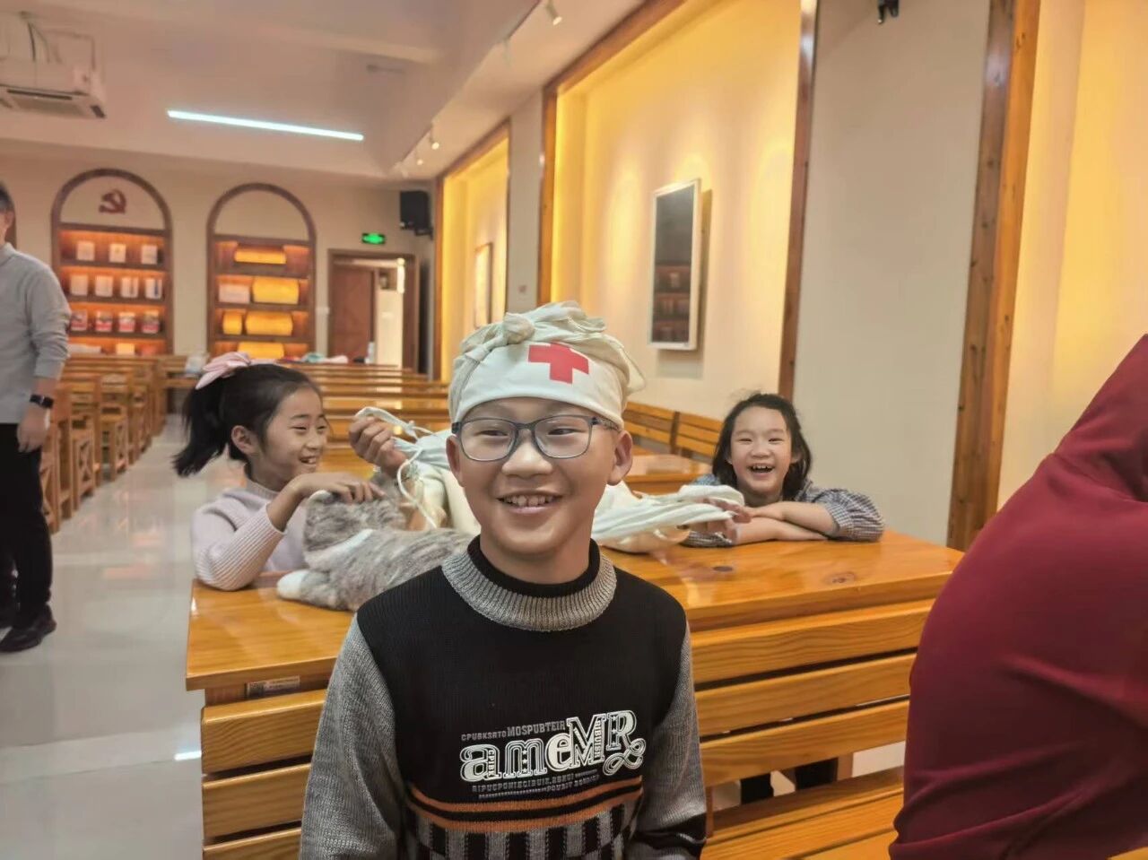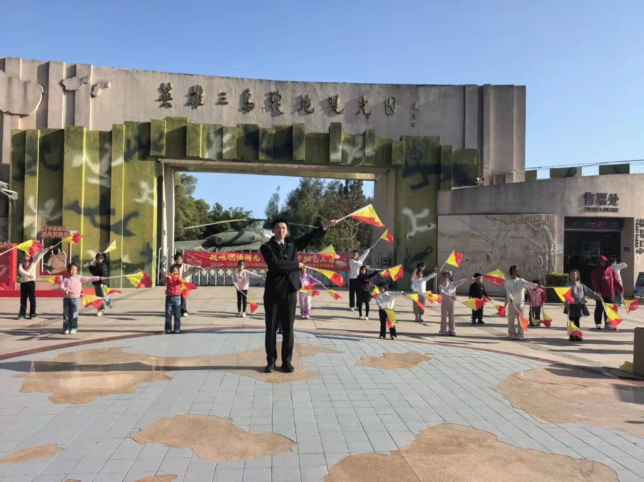 阳光下,孩子们挥舞着红黄相间的信号旗,跟着志愿者学习航海信号,成为战地观光园里一道活泼的风景线。