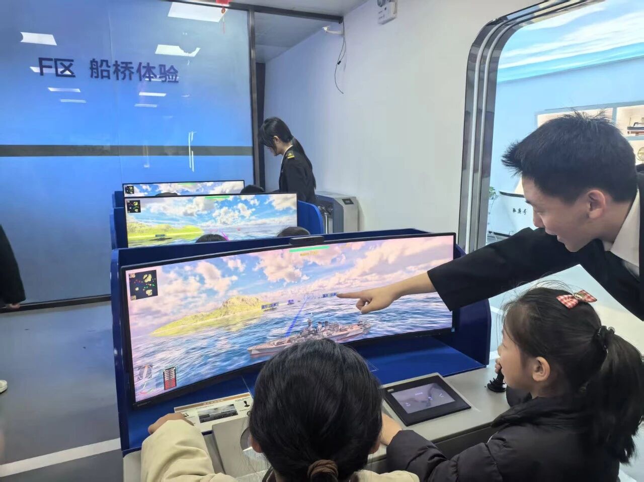 在船桥模拟体验区,孩子们化身“小小航海家”,在志愿者的指导下操作模拟舰船,沉浸式感受航海的魅力。