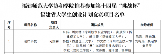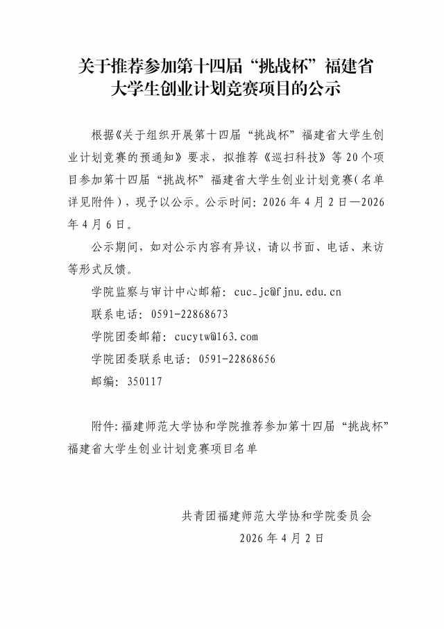 根据第十四届“挑战杯”福建省大学生创业计划竞赛的相关要求,现对我校信息工程学院光电5211班陈昆翔跨校参加第十四届“挑战杯”福建省大学生创业计划竞赛的学生情况进行公示
