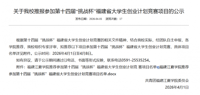 根据第十四届“挑战杯”福建省大学生创业计划竞赛的相关要求,现对我校海洋生物学院水族3232班学生许嘉宁、航海学院教师吕文庭跨校参加第十四届“挑战杯”福建省大学生创业计划竞赛的情况进行公示。