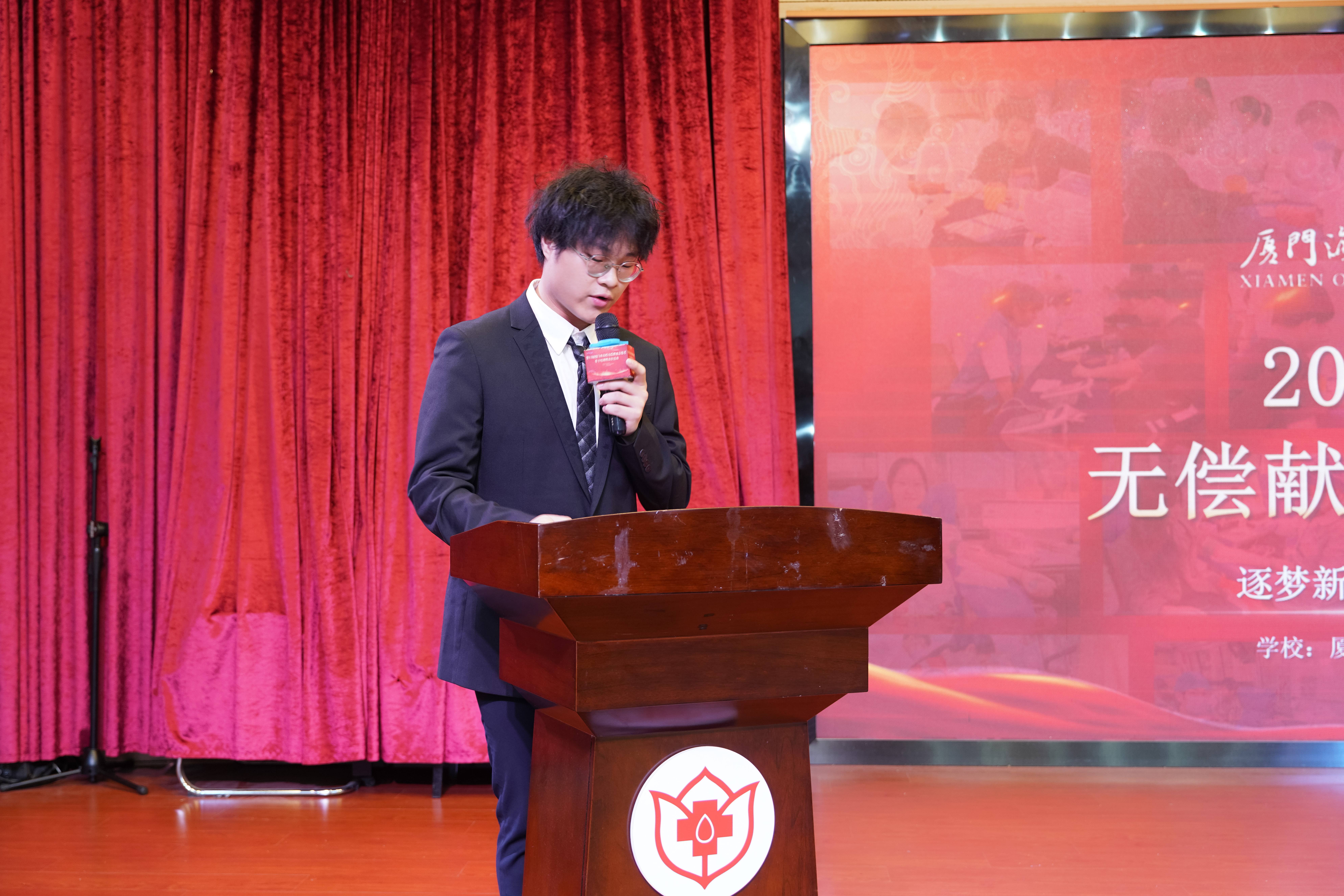 踏入大学后,叶世杰怀着服务社会的一腔热情,主动加入无偿献血服务队。在2024年上半年,他以总策划人身份成功组织并开展了校园无偿献血活动,活动成效显著,获得了厦门市血站及多家单位的高度认可。在厦门市高校无偿献血表彰大会上,他作为学校代表登台发言,并获评2023年度“厦门市无偿献血优秀志愿者”荣誉称号。校主嘉庚先生曾言:“国家之本,在于教育。”作为一名海院学子,叶世杰始终以实际行动践行嘉庚精神,积极投身志愿服务,争做新时代的志愿先锋。截至目前,他的志愿服务时长已累计超过330小时,个人总献血量达800ml。