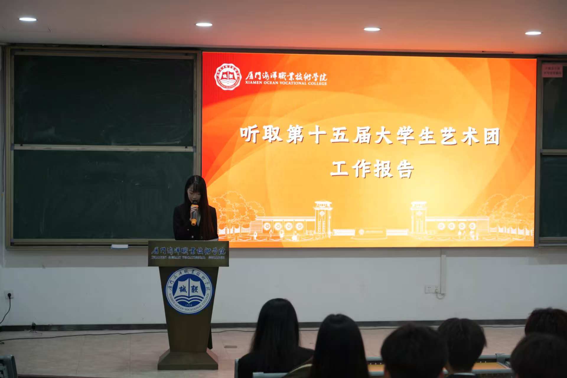 大会中,许嘉宁同学代表第十五届艺术团作工作报告,全面总结了过去一年在思想引领、组织建设、美育实践等方面取得的丰硕成果。黄雅婷同学宣读了《厦门海洋职业技术学院大学生艺术团章程》(2025修订版)。
