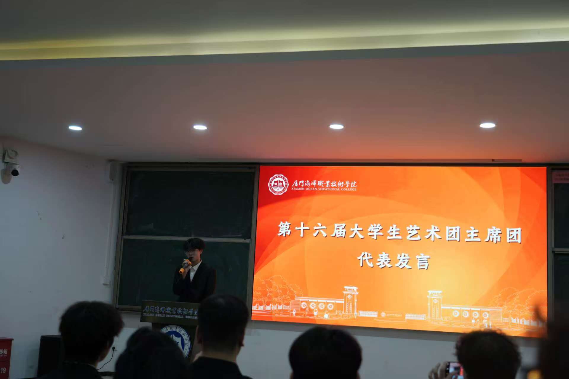 江泽朋同学代表第十六届艺术团发言,他表示将以嘉庚精神为底色、以海院拼搏精神为动力,团结引领艺术团全体成员在艺术沃土上深耕厚植,为学校发展注入澎湃青春力量!