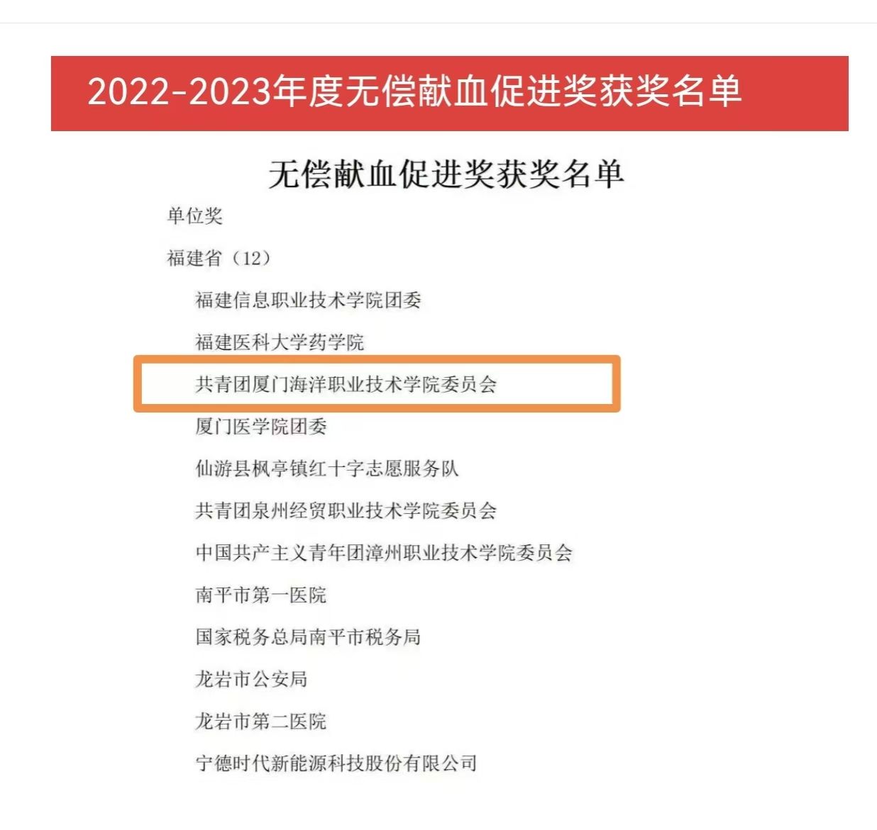 近日,国家卫生健康委员会、中国红十字会总会、中央军委后勤保障部卫生局联合揭晓 2022-2023年度全国无偿献血表彰名单,这份承载着“生命敬意”的荣誉榜单中,校团委凭借扎实的组织工作与全校师生的热忱参与。成功斩获2022-2023年度无偿献血促进奖!我校的这份荣誉,既是对过往工作的肯定,更是海院人用行动践行“奉献为民”初心的生动见证。