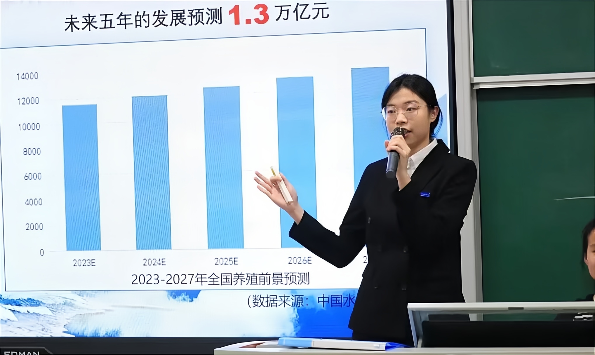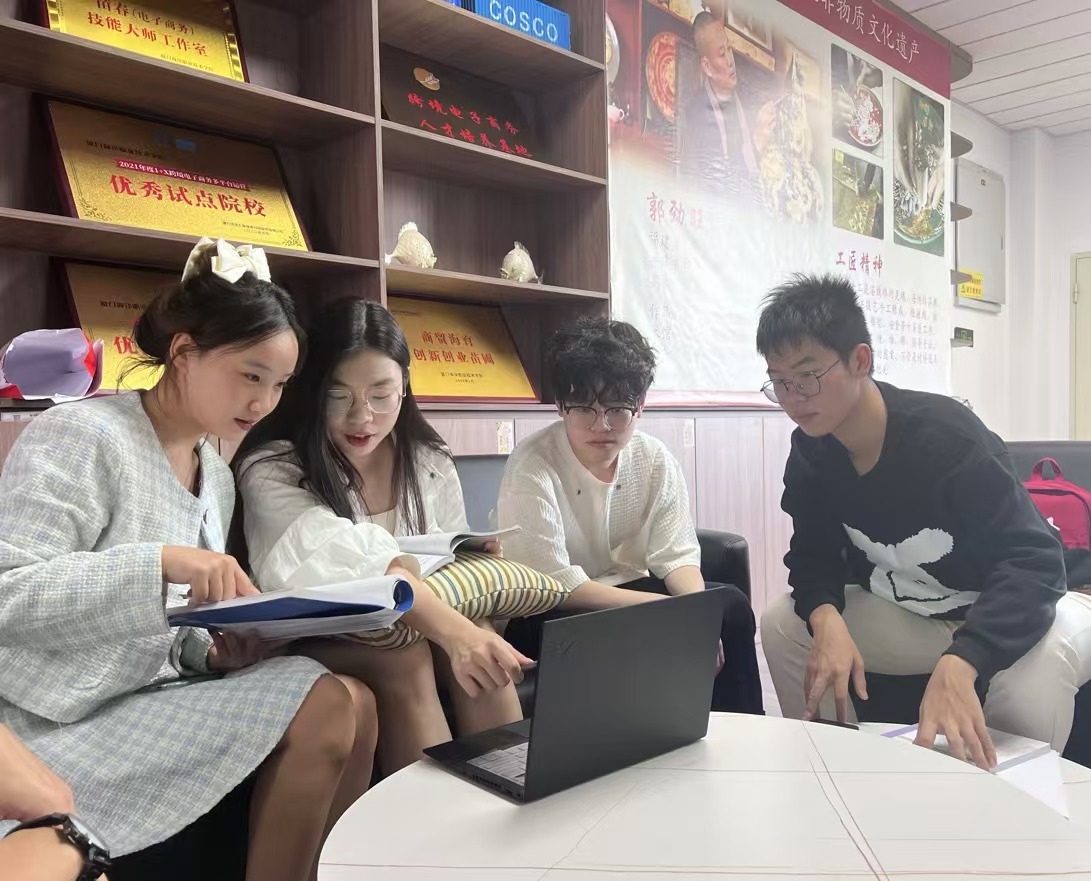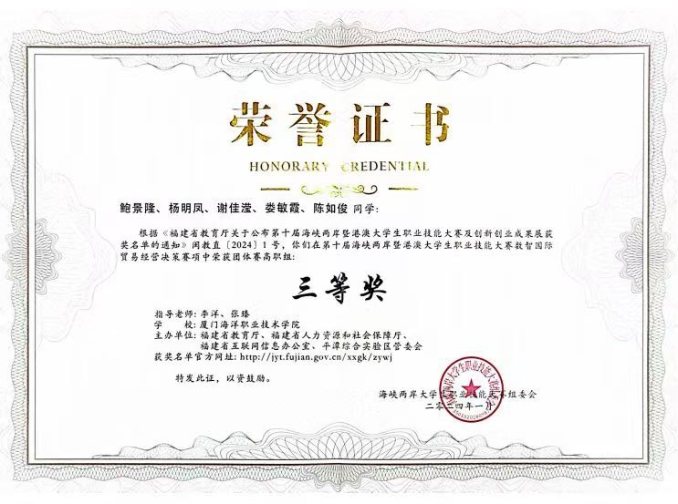 她始终秉持“以赛促学、学以致用”的理念,将专业知识转化为竞赛动能。在夯实语言基础的同时,她注重商务实践能力的培养,凭借扎实的专业功底和敏锐的商业思维,在第十届海峡两岸暨港澳大学生职业技能竞赛中,她带领团队运用数字化工具完成国际经营贸易决策分析,最终斩获数智国际经营贸易决策三等奖。在双创大赛方面,她参与了北控水务杯第六届中国国际“互联网+”生态环境创新创业大赛、首届全国高校智慧渔业设计大赛和第十三届“挑战杯”福建省大学生创业计划竞赛等赛事,累计获得荣誉奖项30余项。这份光鲜的成绩单背后,是无数个不为人知的艰苦日夜。面对竞赛和学业的双重压力,这种艰苦是成倍叠加的,这也让她不得不学会碎片化时间管理。课间10分钟的单词速记,午休的一小时用来与团队碰头打磨演讲稿,甚至是吃饭时都在默记路演稿。每一份荣誉的背后,都是汗水与智慧的结晶,是青春奋斗的最美见证。