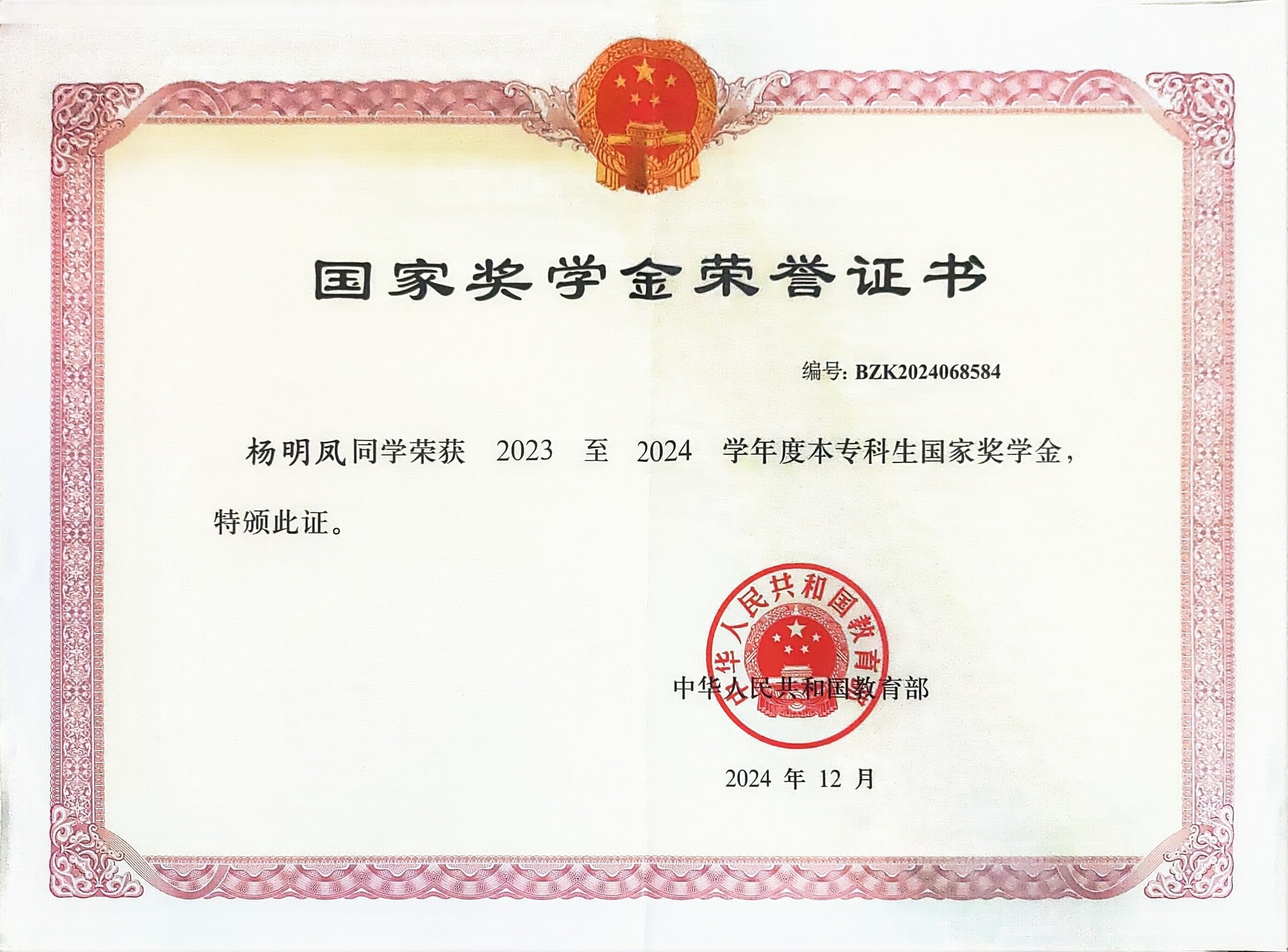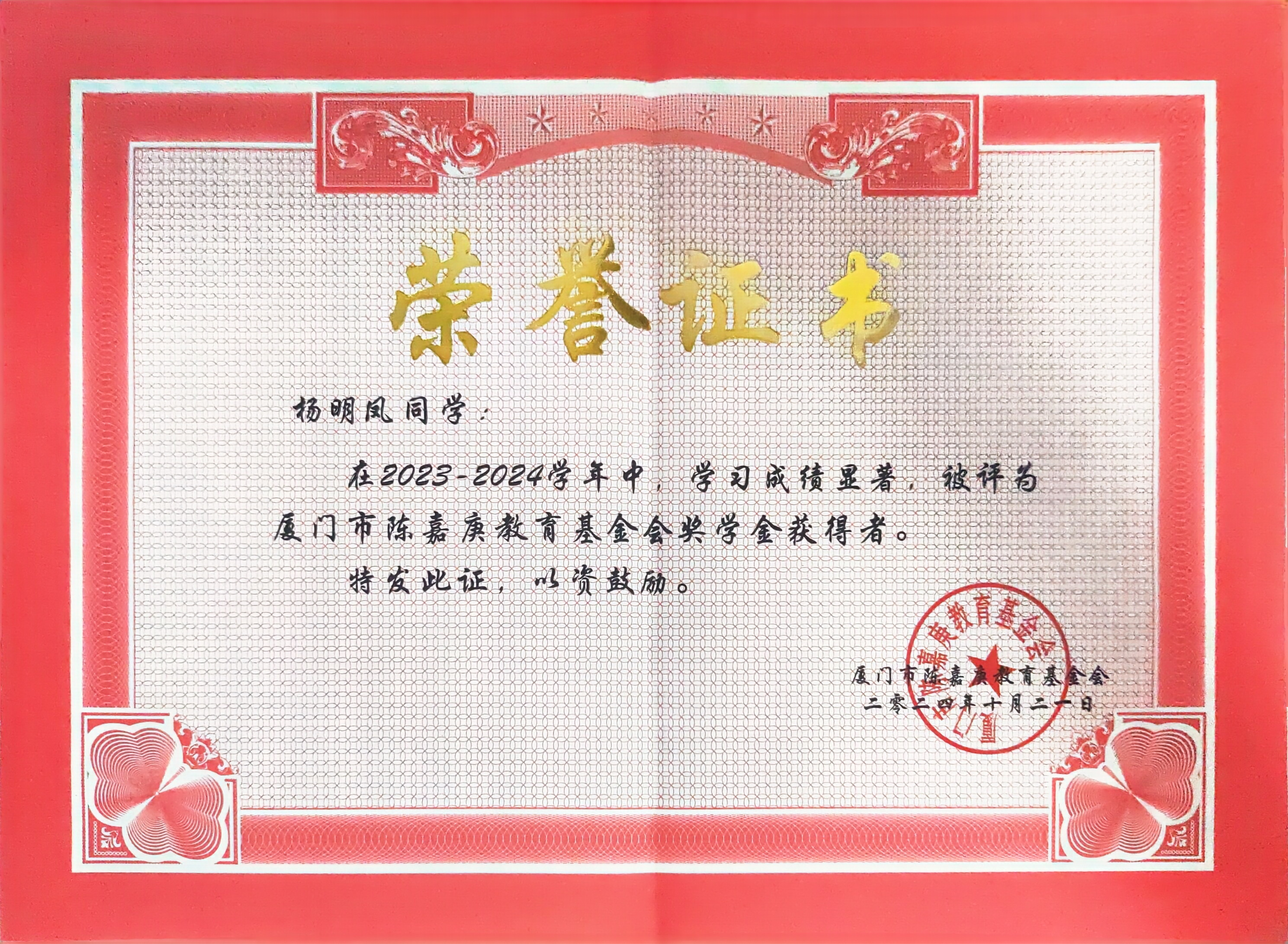 “与其课后花双倍时间补漏,不如把课堂每一分钟都攥在手里”,这句写在笔记本扉页的话,是杨明凤的学习信条。课堂上,她从不会做“被动接收”的听众,而是把自己当成课堂的主角,聚精会神地融入进去。面对没吃透的知识点,她总是及时地找老师厘清,以确保每一堂课的内容都能“当天消化、不留死角”。在她看来,学习从不是“机械堆砌”,而是“方法与坚持的结合”。她从不会盲目追赶进度,而是根据课程难度与自身掌握情况,制定清晰的学习计划。也正因如此,她得以在长期的学习中做到效率与效能的双提升,也让优异的成绩成为了水到渠成的结果,获得了国家奖学金、厦门市陈嘉庚教育基金会奖学金及三次校一等奖学金。