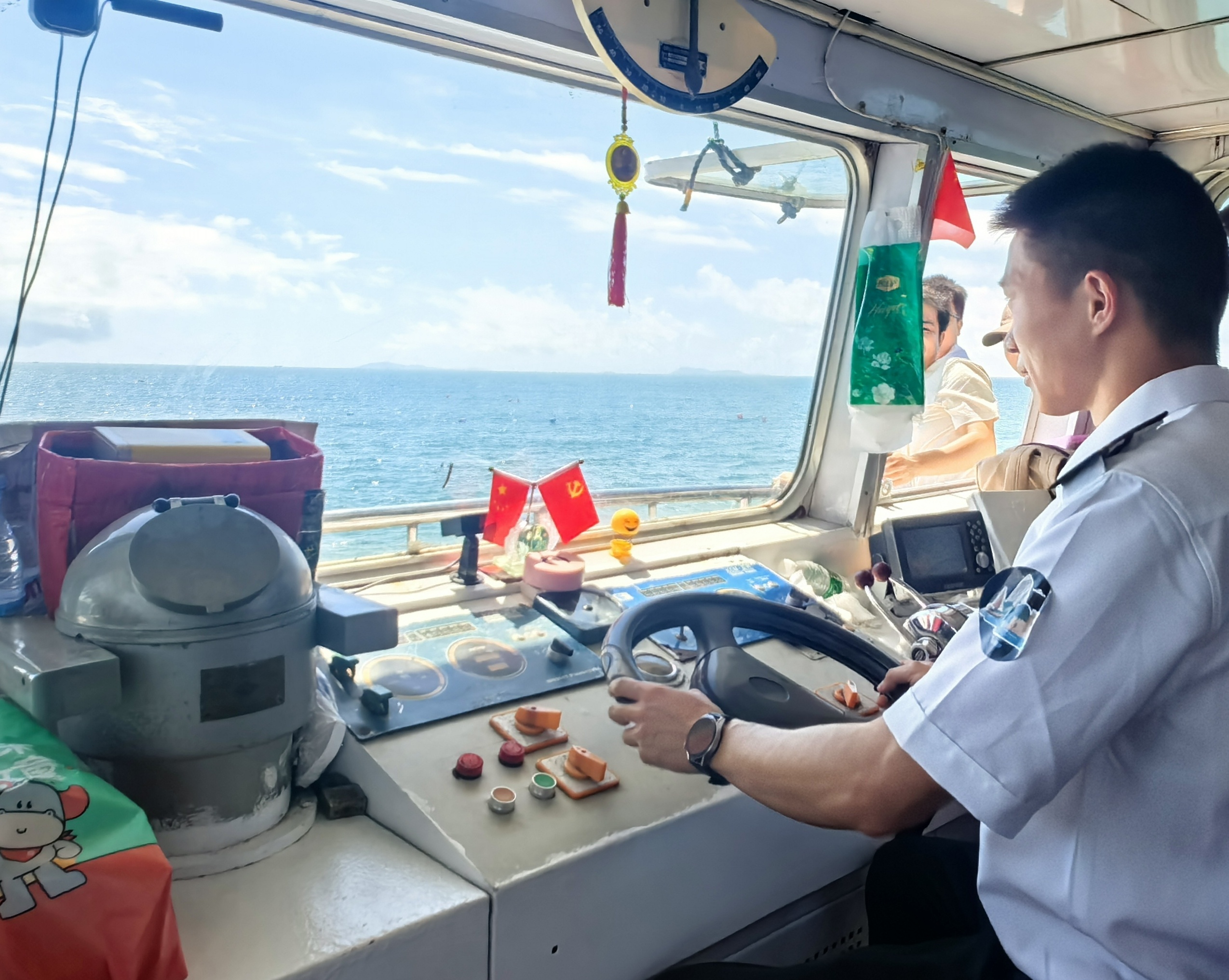 穿越30海里风浪抵达北礵岛,实践队即刻展开立体调研:7月5日上午,为在实践中锻炼学生的实操技能,切实感受船舶驾驶过程中的零部件及技术问题,实践队成员在航行中尝试驾驶船舶,为团队科研精进建言献策。