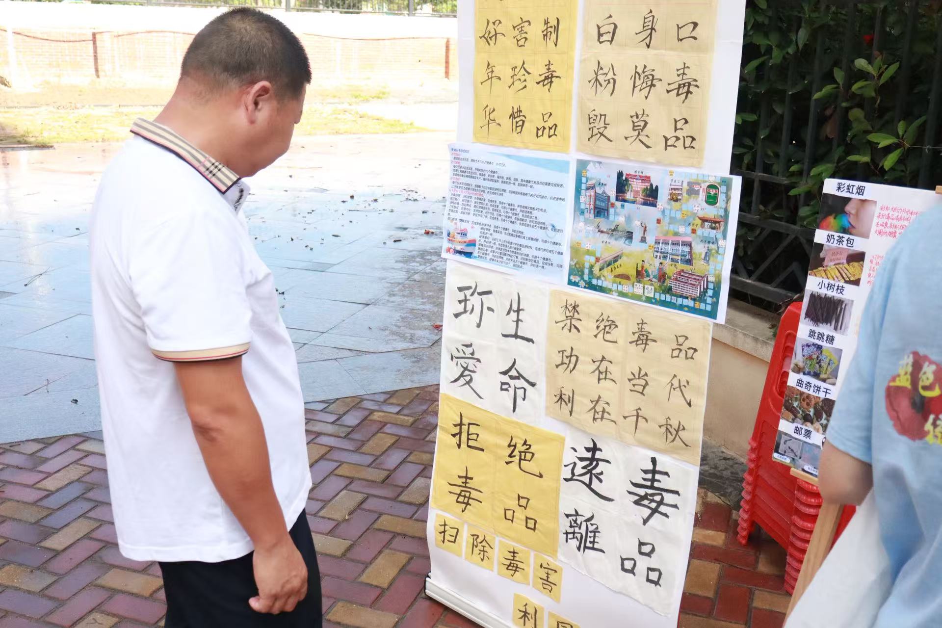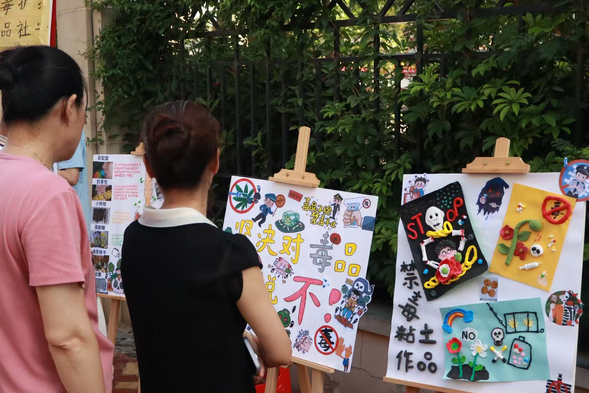 实践队在社区内布置禁毒文创作品展览,社区广场瞬间变身禁毒艺术长廊。通过氛围营造让禁毒理念浸润人心。在一幅幅色彩鲜明的宣传展板上,卡通警察与毒品斗争的生动画面,搭配“坚决对毒品说不”的警示语直击人心;书法展区内,“珍爱生命,远离毒品”等箴言,传递着禁毒的坚定决心。不少居民驻足欣赏,将作品分享至社交平台,让禁毒宣传从线下展览延伸到线上云端,营造全民参与的浓厚氛围。