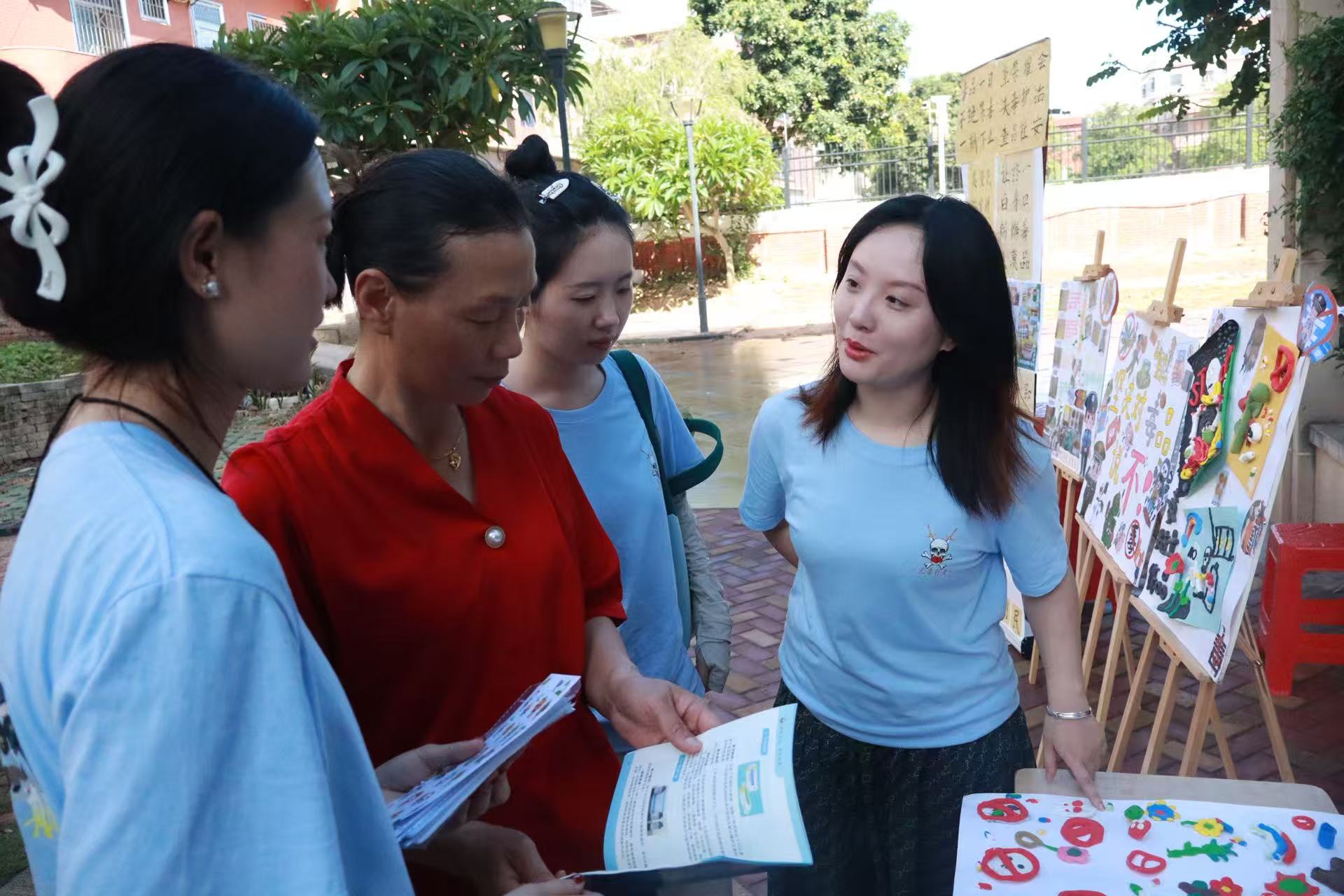 在禁毒文创作品展览区的另一侧,实践队成员为社区居民分发禁毒宣传手册,结合手册中的真实案例详细讲解如何识别毒品、防范毒品侵害,解答居民们的疑问,提升社区居民的防毒意识,助力社区织密禁毒安全网。