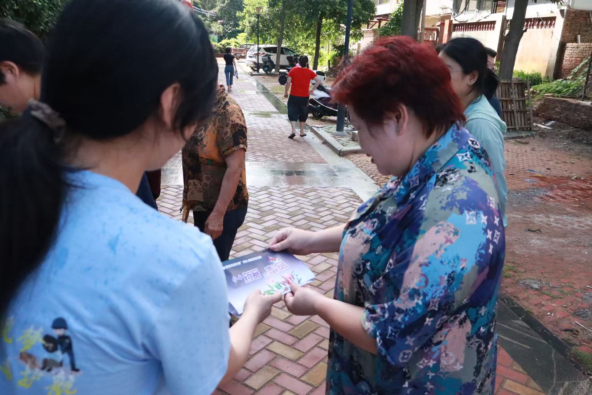实践队成员为社区居民发放禁毒宣传手册