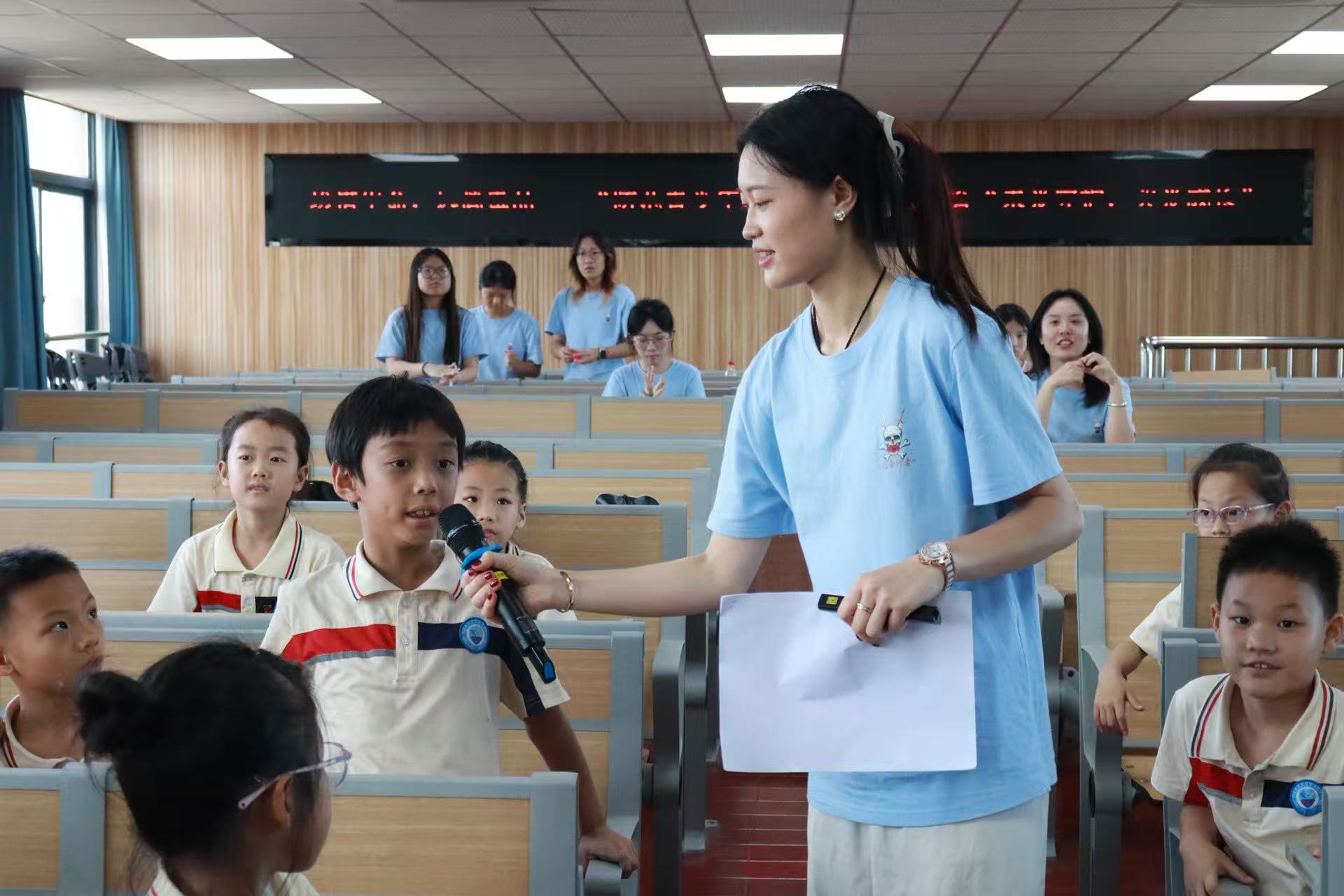 实践队成员用一段动画视频拉开宣讲序幕,通过图文并茂的PPT展示,向孩子们讲解毒品危害及防范方法,在有奖竞答环节孩子们高举小手,踊跃回答问题,现场气氛持续高涨。