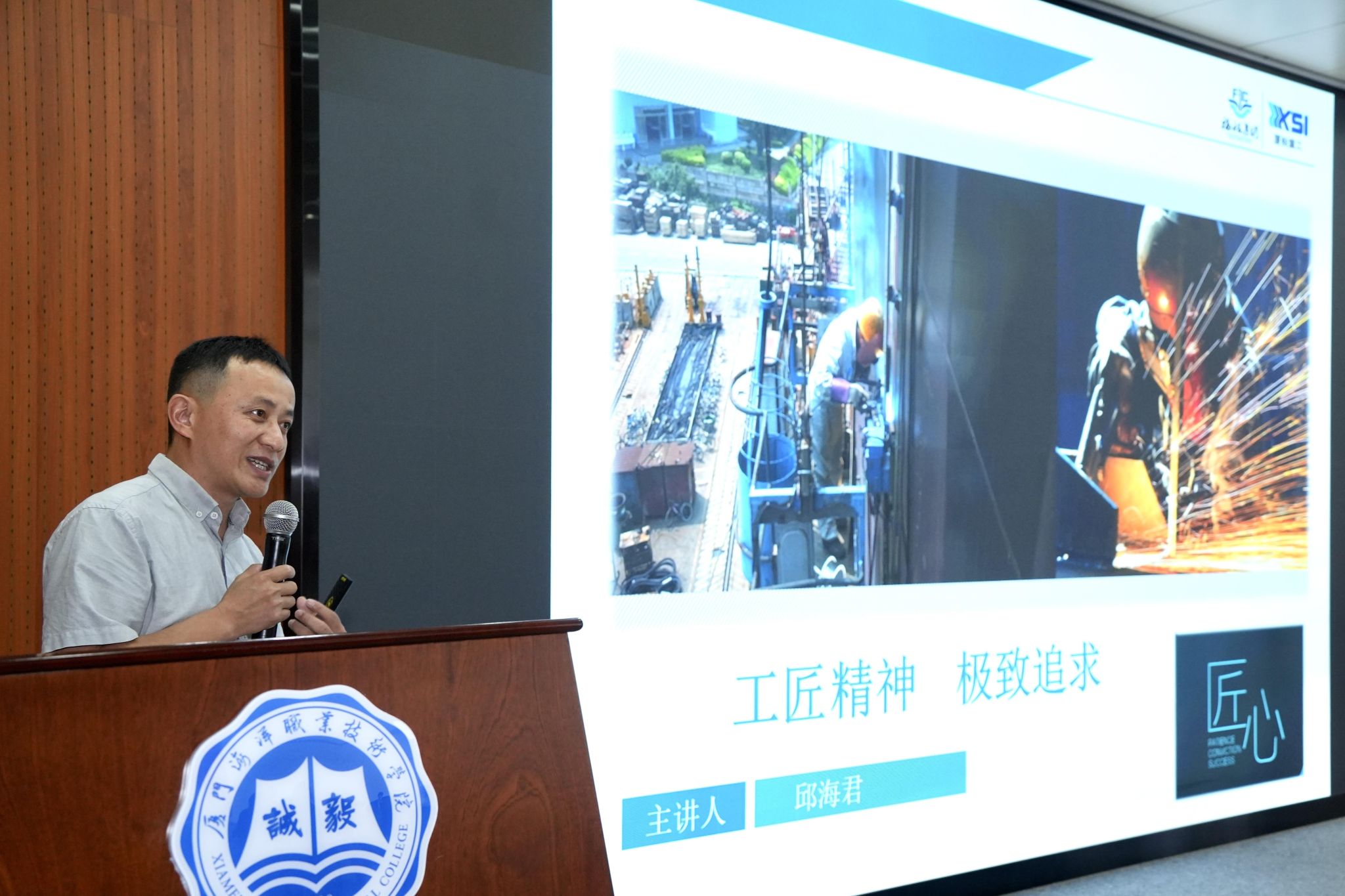随后,船舶电焊工高级技师、船舶工程高级工程师、全国技术能手、国家级技能大师邱海君老师为大家带来了微团课《用“工匠精神”打磨青春》。邱老师以生动的事例和深刻的见解,阐述了“工匠精神”的内涵与价值。他鼓励同学们在学习和生活中,秉持精益求精的态度,用“工匠精神”打磨青春,为实现个人梦想和国家发展贡献力量。这堂微团课不仅是一次思想的洗礼,更是一次行动的号召,激励着同学们在青春的道路上追求卓越。