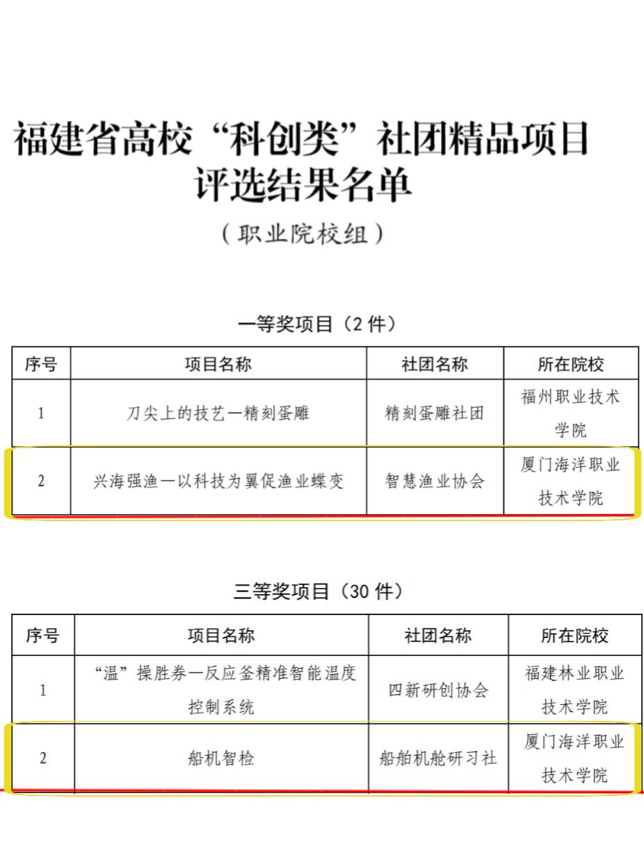 近日,由共青团福建省委主办、福州大学承办的2025年福建省高校“科创类”社团精品项目评选活动结果揭晓,我校海洋机电学院周峰、魏茂春老师指导的智慧渔业协会《兴海强渔—以科技为翼促渔业蝶变》项目,凭借深度融合前沿科技与渔业发展的需求,从众多项目中脱颖而出,一举夺得职业院校组“一等奖”!航海学院黄云江、李德山老师指导的船舶机舱研习社《船机智检》项目,荣获职业院校组“三等奖”!