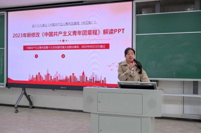 校团委曾美静老师为大家讲授了《团章》。她围绕总则和十个条例为大家逐一解读了《团章》中的每条内容。她指出《团章》承载着中国共产主义青年团的光荣传统和优良作风,是每一名团员青年的必修课,是履行团员义务、彰显团员先进性的基本保障。希望大家从学习团章开始,进一步锤炼品格,增强思想政治素质和理论水平,坚定共产主义理想和新时代中国特色社会主义信念,在思想上和行动上向团组织靠拢。