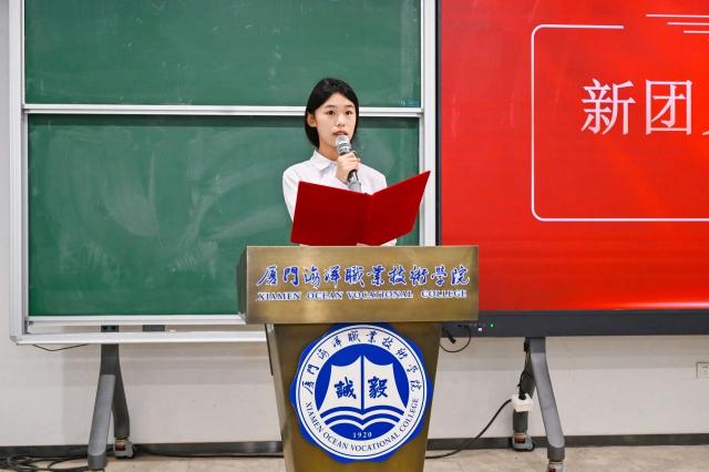 主持人首先介绍了校主嘉庚先生的爱国主义精神,并宣读了150名的新团员名单。老团员代表为新团员颁发团员证、团章,佩戴团徽。