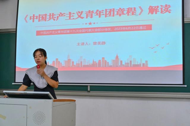 校团委曾美静老师为大家讲授了《团章》。她围绕总则和十个章节逐一为大家解读了《团章》中的内容。她指出,《团章》是每一个共青团员必须遵守的基本准则,学习《团章》是每一名团员的必修课。她希望大家从学习《团章》开始,不断提升自身思想的高度,不断提高自身知识的深度,坚定理想信念,在各个方面不断向团组织靠拢。
