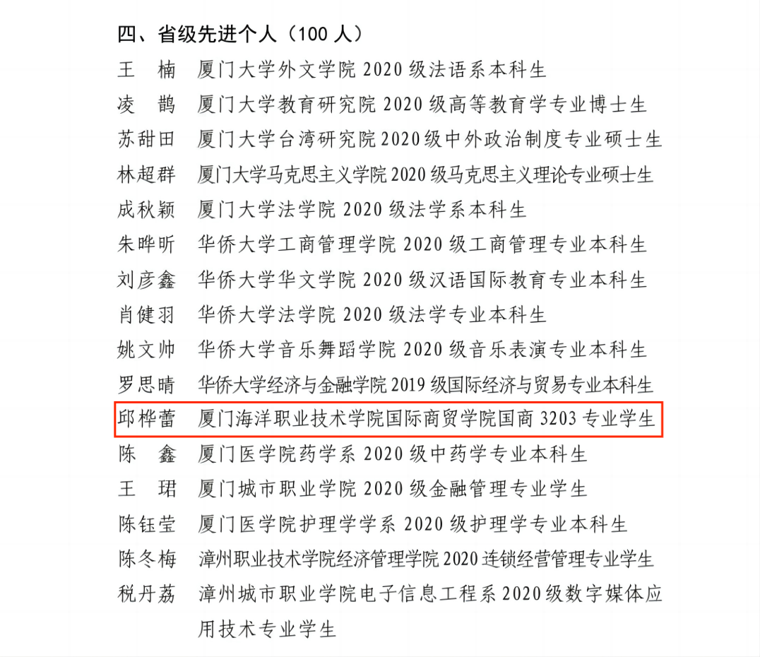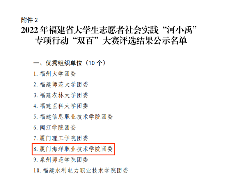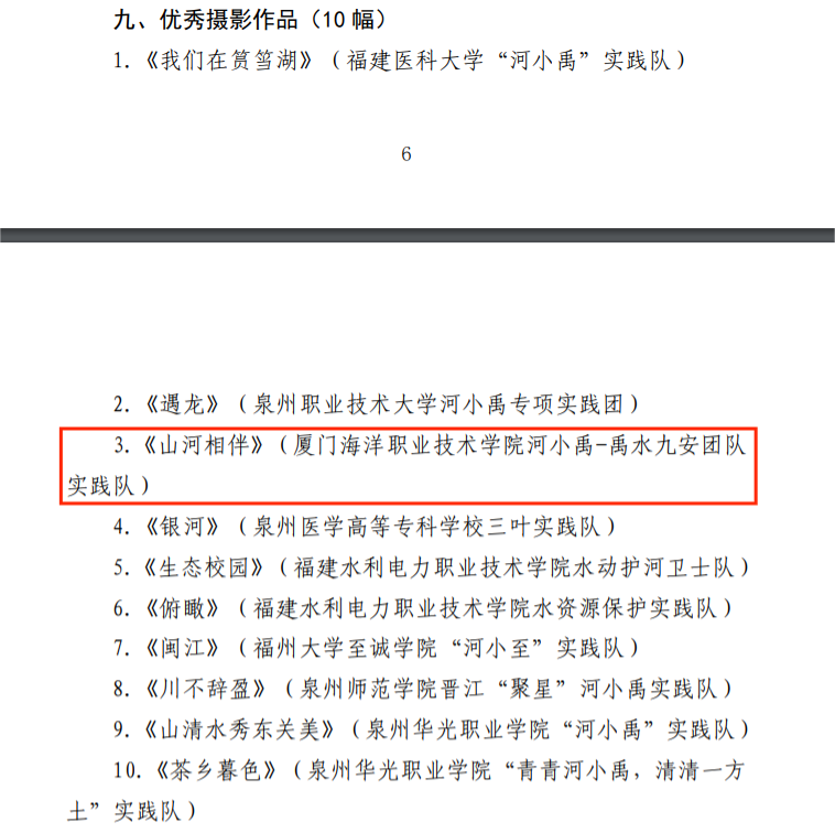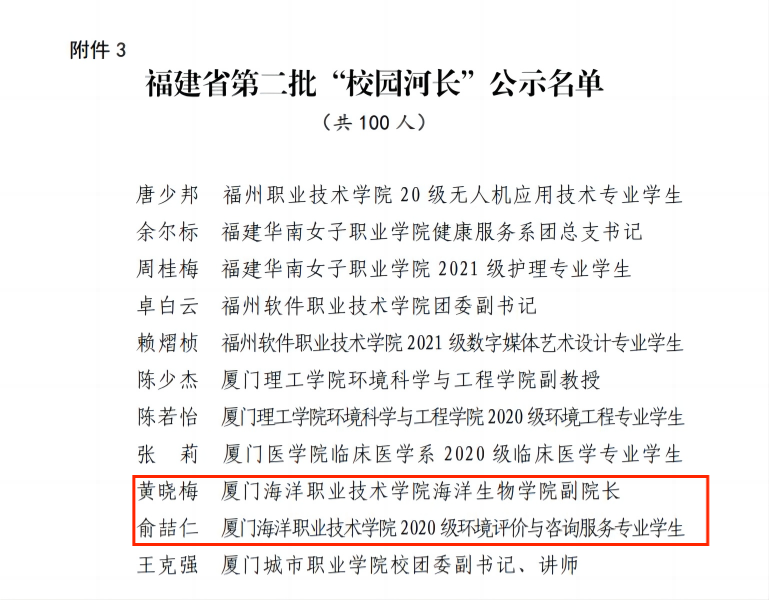 近日,在共青团福建省委发布的《2022年福建省大中专学生志愿者暑期“三下乡”社会实践活动优秀工作典型公示名单》中,我校喜获先进工作者荣誉1项、先进个人荣誉1项;在《2022年福建省大中专学生志愿者社会实践“河小禹”专项行动“双百”大赛评选结果公示名单》中,我校喜获“优秀组织单位”荣誉1项,优秀摄影作品1项;在《福建省第二批“校园河长”公示名单》中,我校2名师生被聘为“校园河长”。