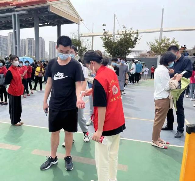 “请大家戴好口罩,提前打开登记码,间隔一米,有序排队核检!”
