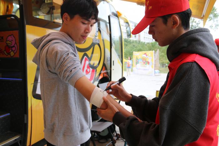当天早上,受到冷空气影响,天气寒冷并下着小雨,但这阻挡不住全院师生那颗乐于奉献的炽热之心。献血车早被他们“重重包围”,仿佛他们身上那股热血早已按耐不住,迫不及待地点燃他人的生命希望。在参加无偿献血的队伍中,有来自18级的大一新生,也有来自行政、教学口的教职员工。很多班级的同学和老师才刚下课,不顾冰冷的雨滴,积极参加无偿献血。他们中有多次献血经历的“老面孔”,也有很多人是初次献血的“新生力量”,虽然首次献血有些紧张,但大家都很勇敢,其中一些女生还选择了最大献血量400ml。很多献血者说:“作为新时代青年大学生, 希望尽个人的微薄之力,向社会奉献自己的一片爱心,让生命更有意义”。