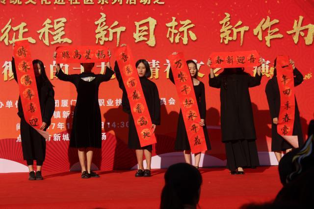 此次文艺活动内容丰富,文艺节目多姿多彩,有幼儿舞蹈、幼儿独唱、老年舞蹈、功夫扇、话剧表演、大合唱、知识问答、书写春联等。联谊活动中演员与居民上下互动、甚至同台演出,不时爆出热烈掌声和欢笑声。其中,我院主要派出了学生社团参与表演,汉服社身着汉服带来了一场《舞韵古风》舞蹈,古姿尽显中国传统风韵;话剧协会为大家上演了一场《招聘》现场,话剧透着紧张又诙谐的气氛;还有我院大学生合唱团为我们带来合唱《我喜欢送别》。台上节目精彩进行的同时,我院书法协会在舞台侧旁书写着新春对联,并在活动结束后赠送给了社区居民。