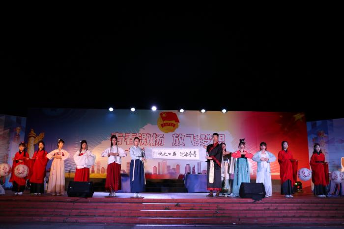 五四文艺专题晚会在开场舞《梦想点亮未来》拉开帷幕,《泱泱华夏,盛世之魂》汉服展示一出场即引来观众阵阵喝彩,讲述了中华上下五千年诗书礼乐美的延续与承载;舞蹈《天竺姑娘》以其奔放的舞姿,欢快的旋律,使观众领略到独特的异域风情;诗歌朗诵《忠诚的灵魂》在向祖国报告,在向人民宣誓,作为当代青年要树立与时代主题同心同向的理想信念,坚定理想信念,方能将忠诚铸入灵魂;歌舞《青春之歌》声情并茂的表演,带给观众心灵的洗礼。