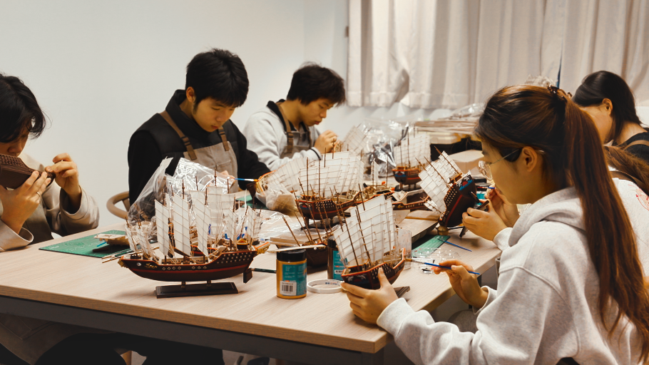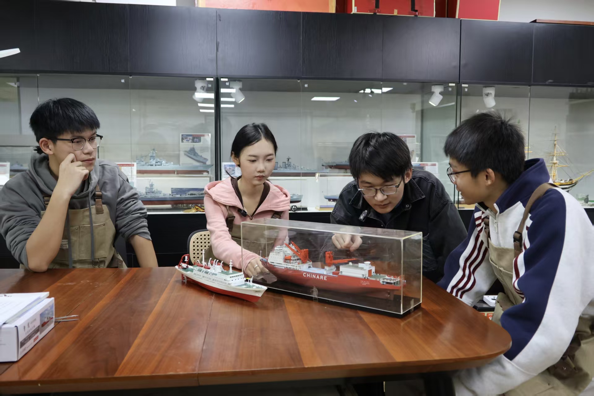 实践队回归教育本位,完成从科普服务到实体文创的实践转化。在学校海洋文化综合科普教育基地与船模大师工作室,实践队背靠学校船模创新班,与省级工艺美术大师合作,将研学探索所得转化为数字化图纸,通过工作室的机器加工,共同开发制作出船模、飞艇、书签、拼图、绳结等海洋主题文创产品与科普教具,实现从研学探访到实体产品的完整闭环。