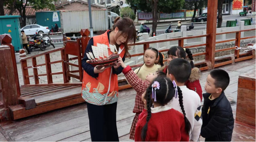 (实践队赴莆田萝苜面向小朋友展示福船文化)