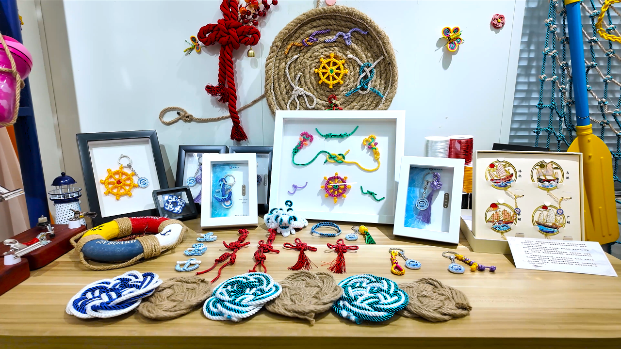 实践队将探索视野从船舶延伸至与之密切相关的航海绳结技艺。团队成员曾寻访浙江两位“渔绳结”非遗传承人,系统学习并记录了多种传统渔绳结的打法与应用场景。在已有基础上,队员们充分发挥创意设计能力,开发出系列海洋主题文创产品。将航海常用的丁香结、平结、五星防撞结等,创新设计成船锚、船舵造型的钥匙扣、杯垫等实用物品。这些文创作品先后参与了青岛中欧非遗交流展示活动,成为传播海洋文化的有效载体。
