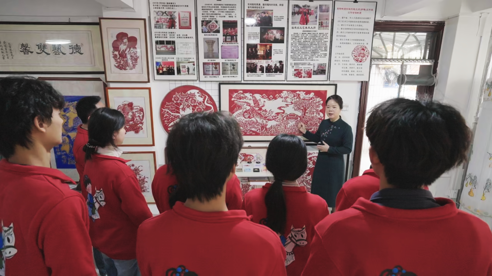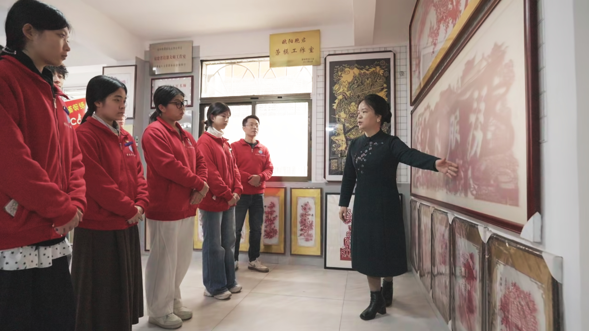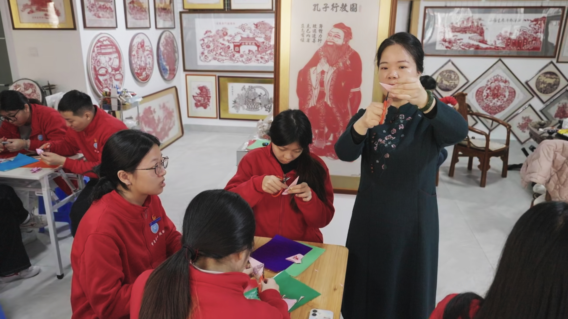 如果说芗剧是流动的乡愁,国家级非物质文化遗产漳浦剪纸便是凝固的文脉。实践队走进民间剪纸工作室,与非遗传承人欧阳艳君老师面对面交流,倾听漳浦剪纸的两岸传承故事,学习体验“阴剪”“阳剪”及漳浦剪纸独创的“排剪”技法。红纸翻飞间,剪刀起落时,寓意吉祥的传统纹样、勾勒两岸民俗的《海峡共庆》等作品跃然纸上,让实践队师生直观感受非遗技艺的独特魅力。