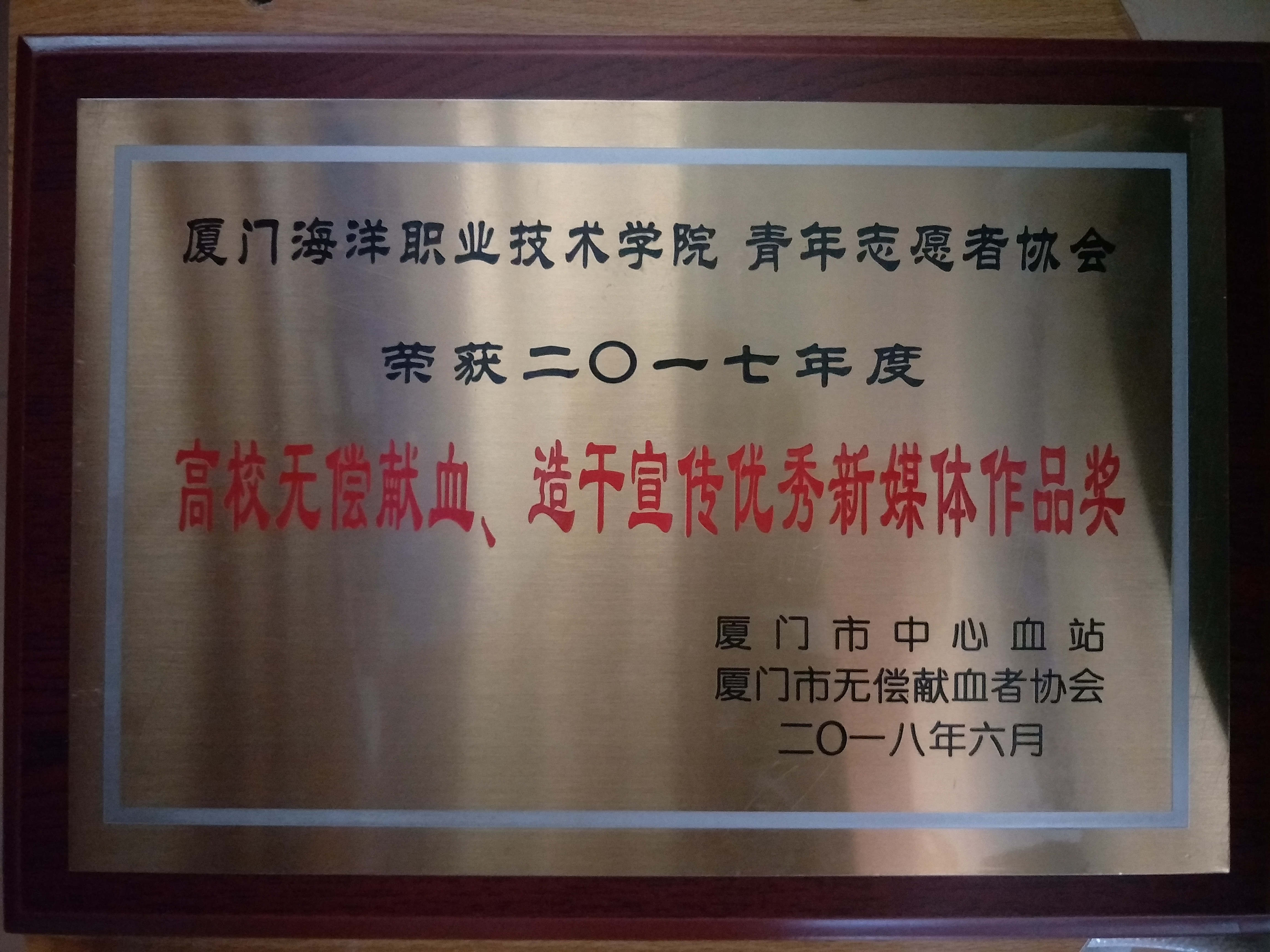 会议期间,各个协会工作受到了厦门市中心血站的各级领导地充分肯定,我院无偿献血服务支队荣获由厦门市中心血站和厦门市无偿献血者协会联合颁发的2017年度“高校无偿献血、造干宣传优秀新媒体作品奖”“ 高校无偿献血、造干宣传优秀平面设计作品奖”。此外,还有10名同学在组织和参与无偿献血活动过程中表现积极荣获高校优秀无偿献血志愿者荣誉称号。