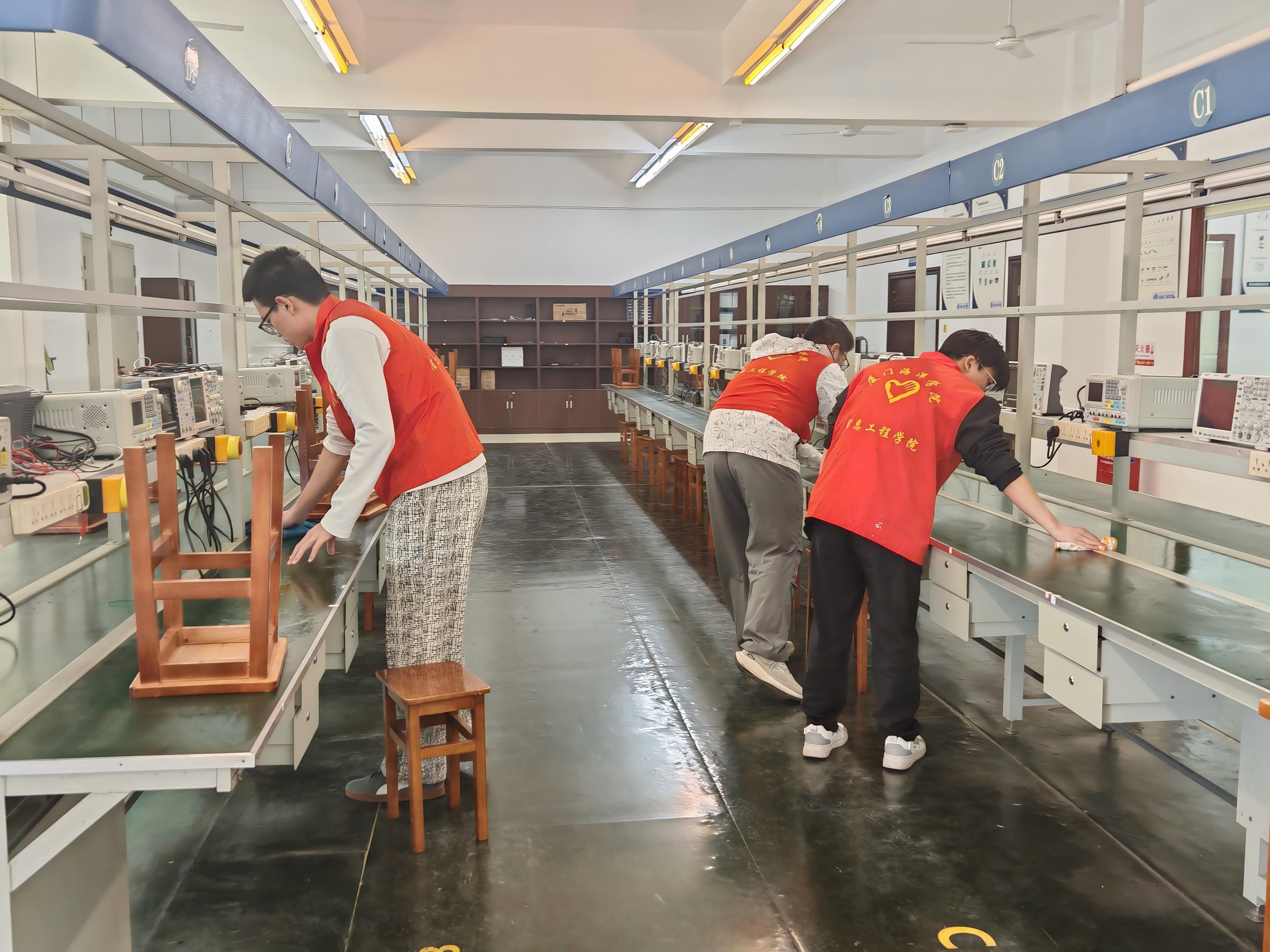 海院机电学院与信息工程学院青年志愿者协会环境清洁行动:志愿者们对教学实训室的仪器设备表面、实验操作台缝隙以及宿舍公共区域进行深度环境清理。志愿者们手持抹布、清洁剂、扫帚等工具,细致擦拭实训设备的油污与灰尘,彻底清除卫生死角的蛛网和杂物,用行动践行“劳动最光荣”的理念,携手营造窗明几净、整洁有序的校园环境。